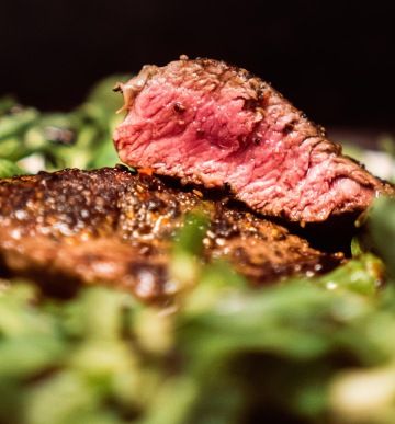 Cajun beef grilled flank steak and tiger prawn, tomato salsa with sesame, potato puree with roasted garlic and wild spinach. A dish where sweet garlic, raisins and sesame with tomato play a role. The fresh beef belly is richly spiced and the whole dish is softened by fresh spinach. Rum Nation Demerara Solera No. 14 is produced in British Guiana. It is a blend of different vintages from the pot still, which imparts full flavour, and lighter rums from the column still. The subsequent 12 months in sherry casks brings out the spicy character of the rum. Finally, a small proportion of very old Enmore rum is added to the blend for added complexity.