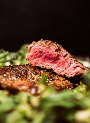 Cajun hovězí grilovaný flank steak a tygří kreveta, rajčatová salsa se sezamem, bramborové pyré s pečeným česnekem a divoký špenát. Pokrm, kde hraje roli sladký česnek, rozinky a sezam s rajčaty. Čerstvý hovězí pupek je bohatě kořeněný a celý pokrm zjemňuje čerstvý špenát. Rum Nation Demerara Solera No. 14 vzniká v britské Guyaně. Jedná se o blend různých ročníků z kotlíkového destilačního zařízení, které dodává plnou chuť, a lehčích rumů z destilační kolony. Následné 12měsíční uložení do sudů po sherry zvýrazňuje kořeněný charakter rumu. Nakonec se do blendu kvůli větší komplexitě přidává malý podíl velmi starého rumu Enmore.